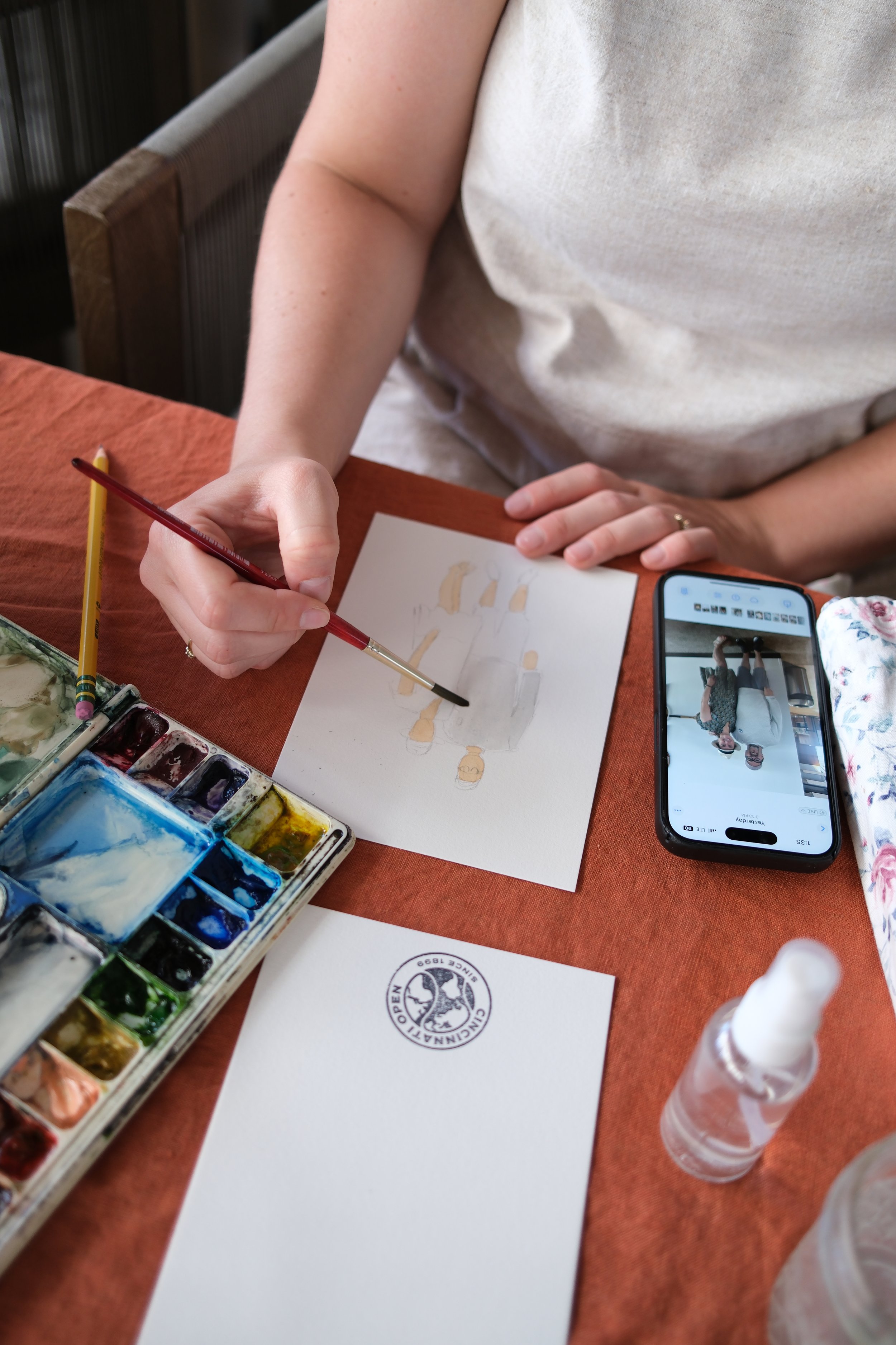 I will come to your wedding and paint 5x7” watercolor sketches of the guests! These paintings are quick and gestural, giving the guests an impressionistic representation of themselves. My assistant or I will take a photo of your guests to use as a reference for the painting so that they can continue to enjoy the night then pick up their completed painting at the end of the night.